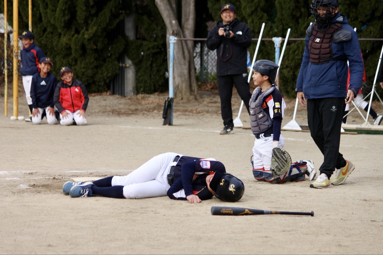 私は、6年生との試合で指導者チームの6番ライトで出場しました。なんと、6年生からデッドボールをいただき(涙)、その後決勝のホームを踏みました!